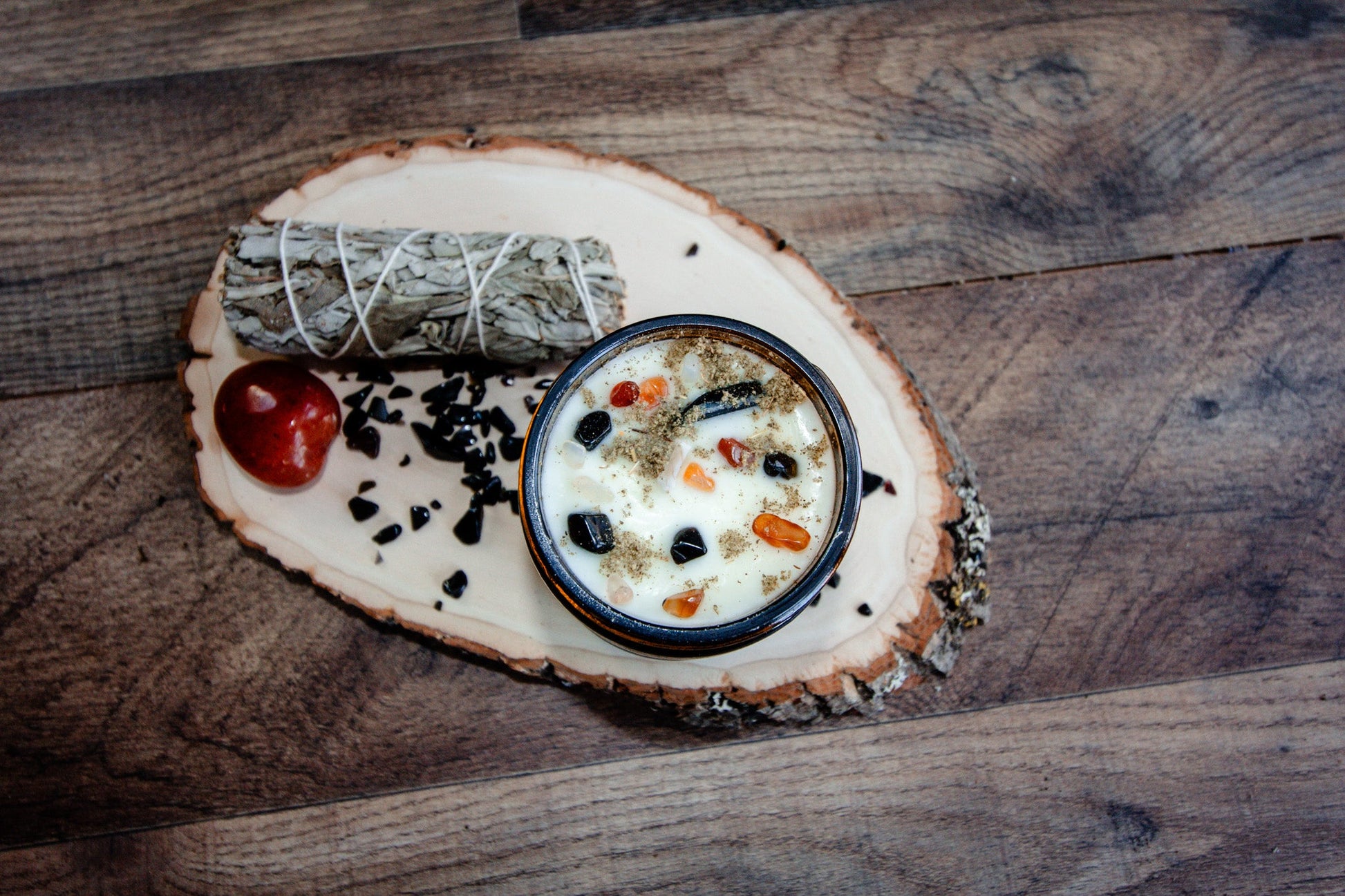 Poured in pure white wax and dressed with crushed sage, obsidian, and carnelian, this candle clears, protects, and energizes all in one go. A carnelian crystal is tucked inside, ready to fire up your confidence and creativity once the junkโs been cleared.