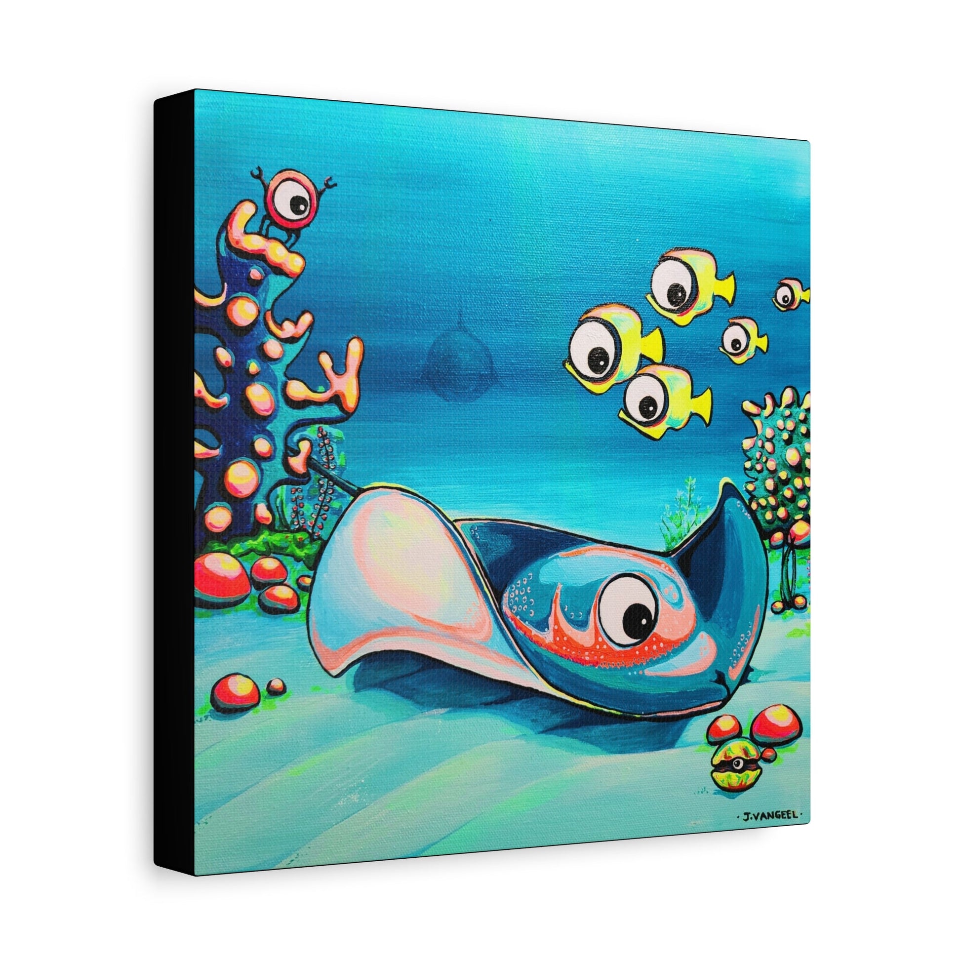 Colorful Cyclops Stingray Canvas Print with original artist design, perfect for adding a pop of color and personality to your home decor. Ideal for art enthusiasts and those looking to elevate their living space. Great for birthdays, housewarmings, and art lovers.