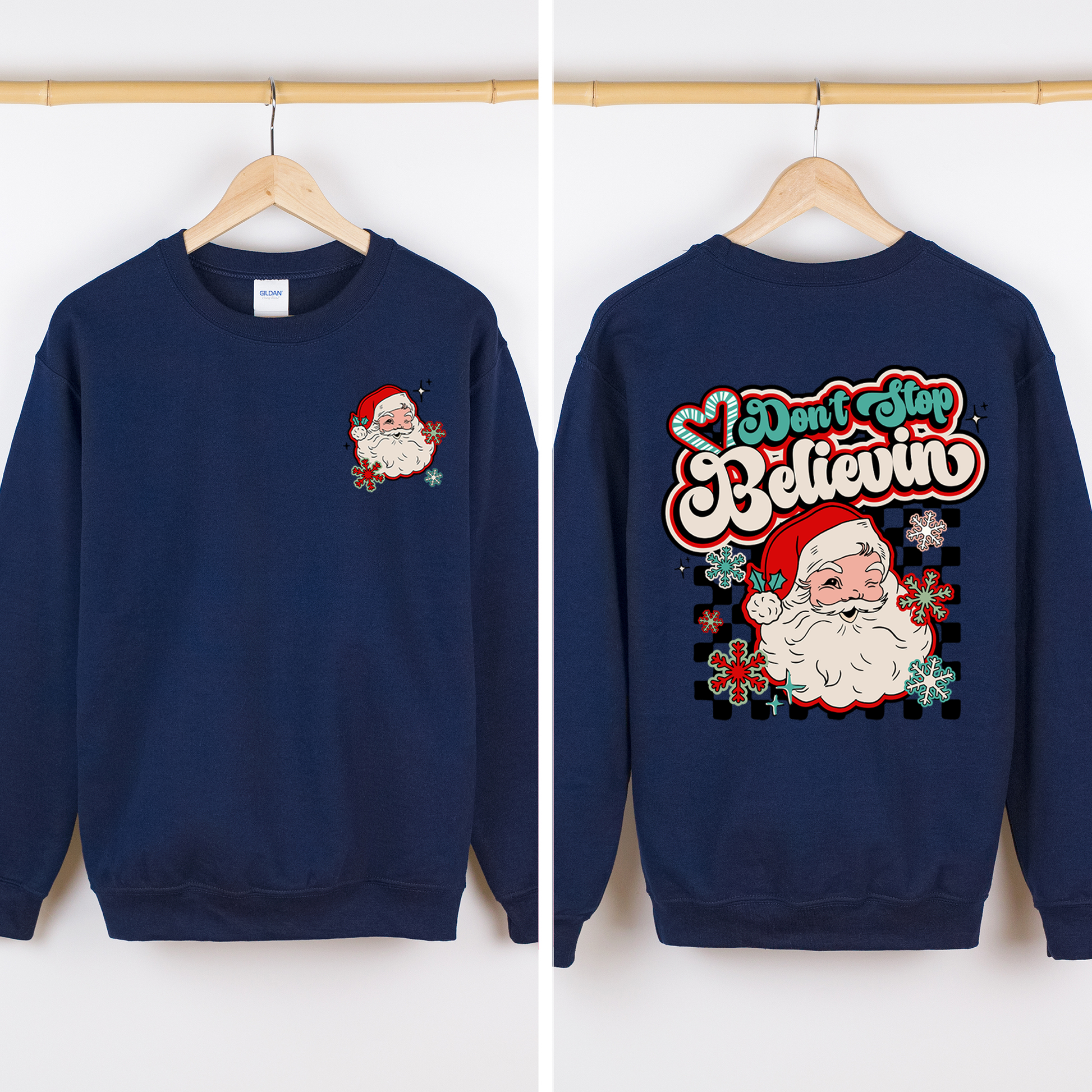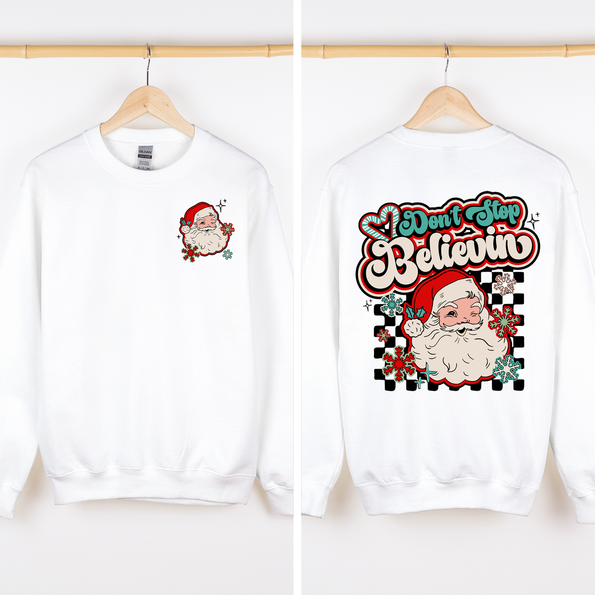 Don't Stop Believin, Santa, Retro, Checkered, Christmas, Front and Back Sweatshirt