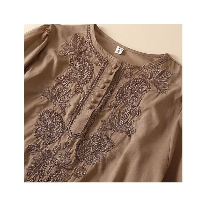 Embroidered Cotton Linen Loose Fit Round Neck Top