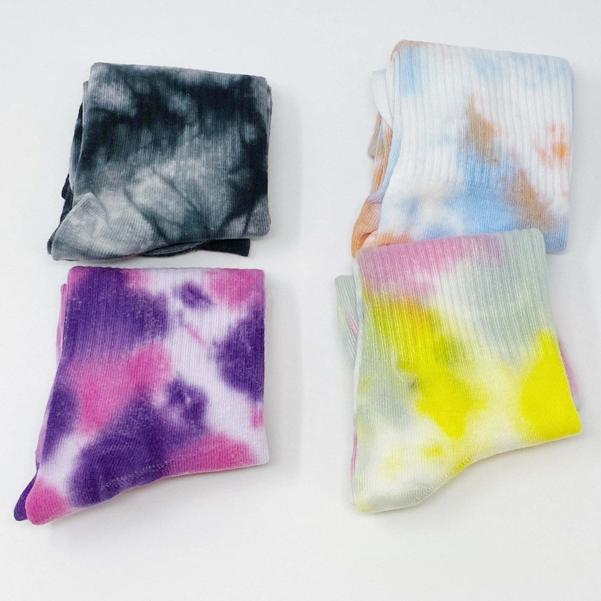 2 pairs of tie dye socks come in this set. Packaged in clear cello bag with Ellison + Young logo sticker in front.