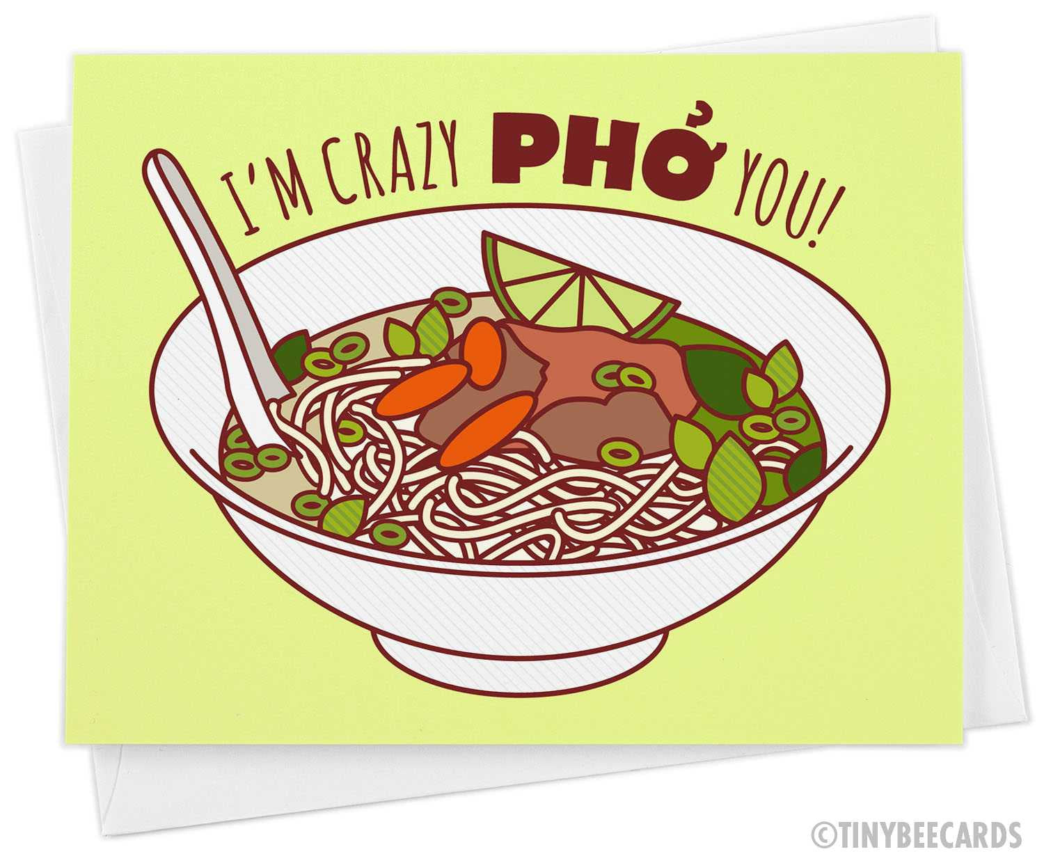 "I'm Crazy Pho You!" Let your significant other know how much you like them with this yummy pho soup card. Great for all occasions - anniversaries, valentine's day, birthdays, or just to say I love you. This is a high quality printed folded card of my original vector art drawing.