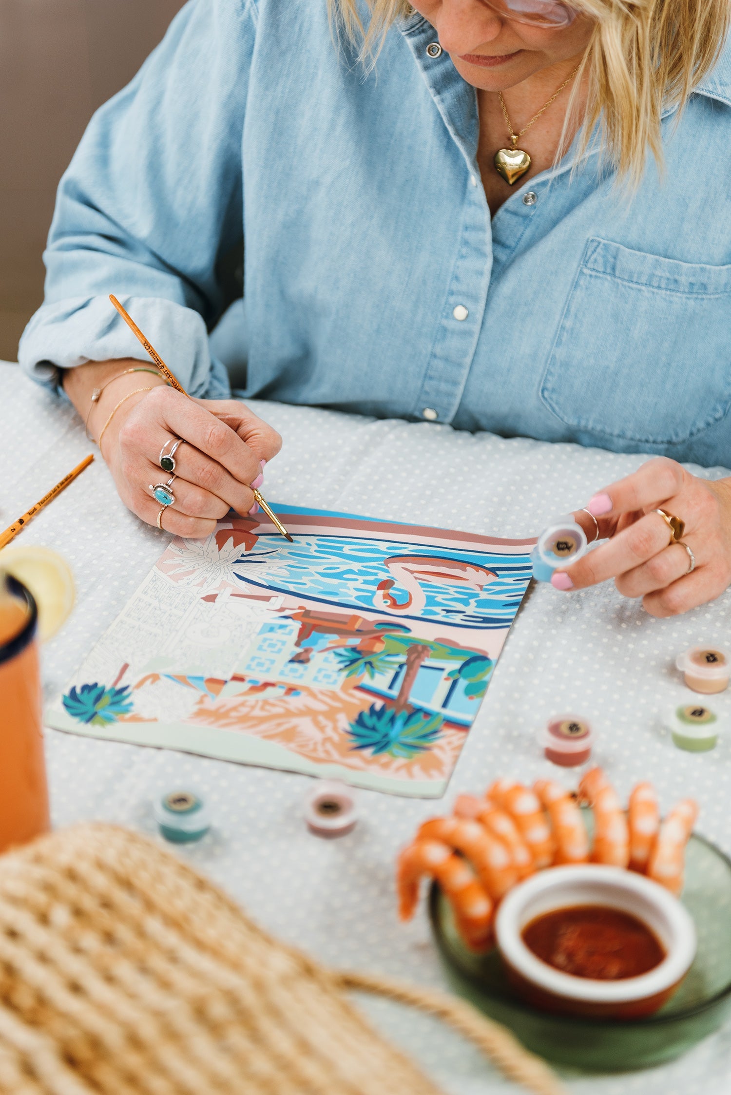 The Mid-Mod Mirage paint-by-number kit features the retro elegance of a Palm Springs-inspired poolside escape including a mid-century ranch and breezy palm trees just beyond the breeze block. Completing the acrylic painting can take 12-14 hours.