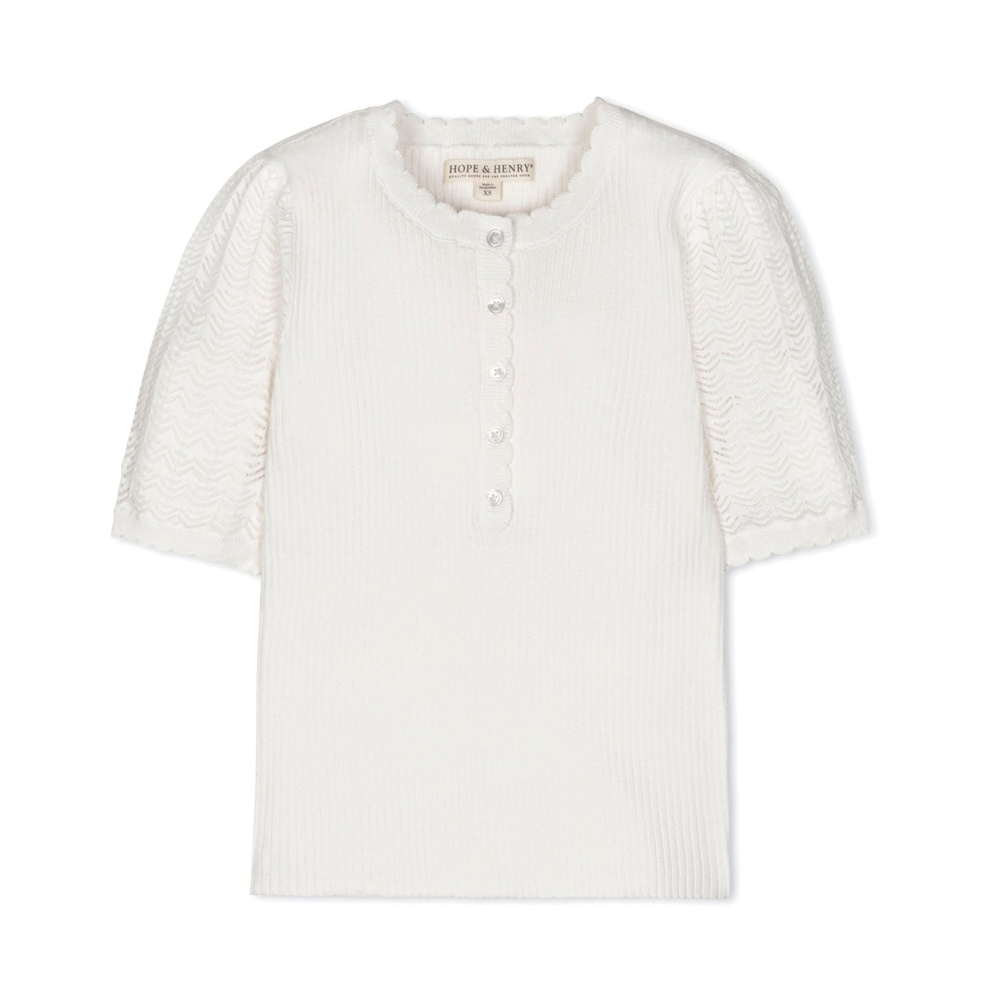 Keep it simple yet chic in our puff sleeve henley sweater crafted from soft organic cotton. Features a henley button placket, scallop edge trim, and a rib knit bodice paired with delicate pointelle knit puff sleeves. Works just as well for the office as it does for date night or weekend brunch.