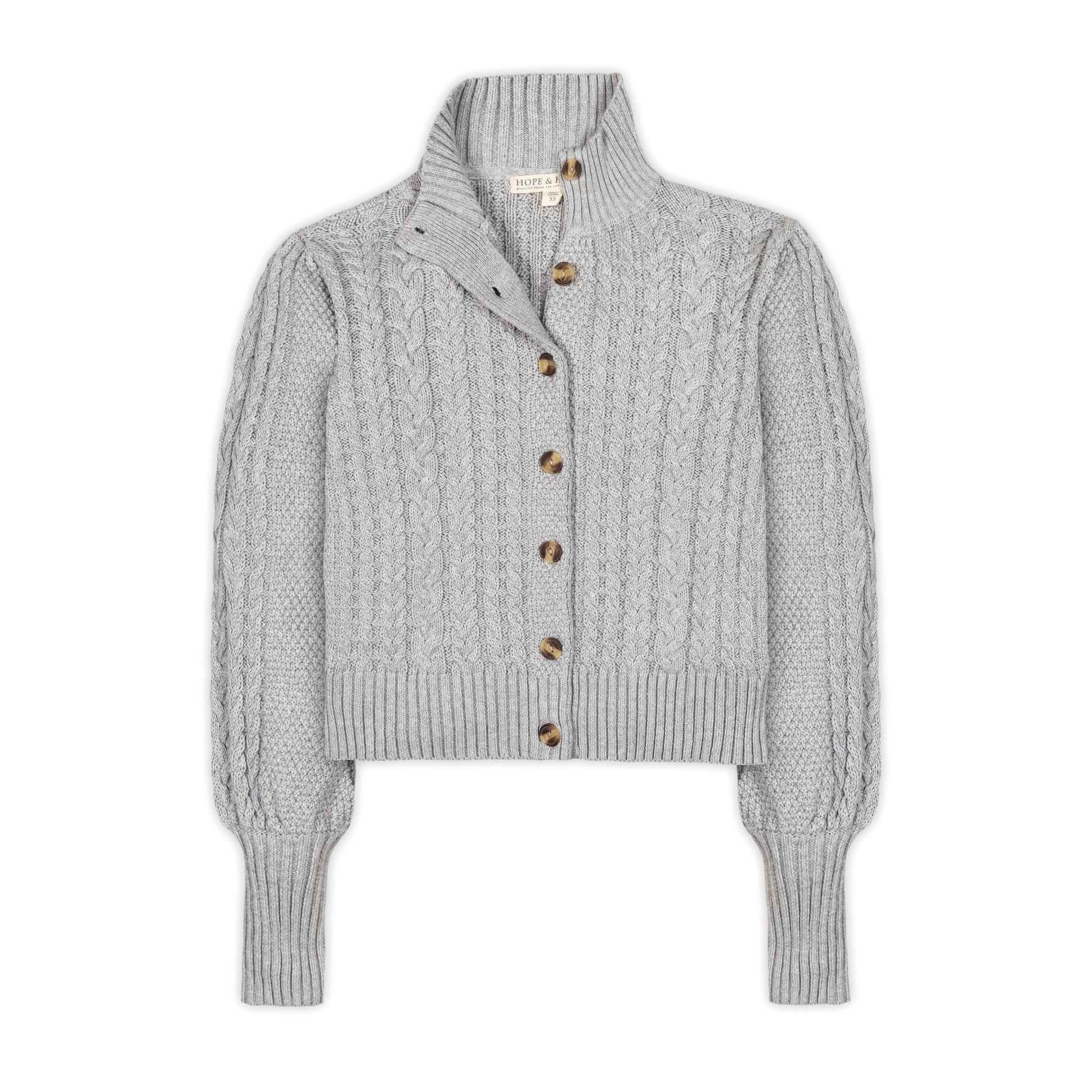 Our mock neck cardigan is a fantastic addition to your fall wardrobe. Features a rib knit mock neck and elongated cuffs, a beautiful allover cable design, and slightly puffed sleeves at the shoulder for a flattering look. We love this as a clean look paired with jeans or leggings and flats with a pop of color.