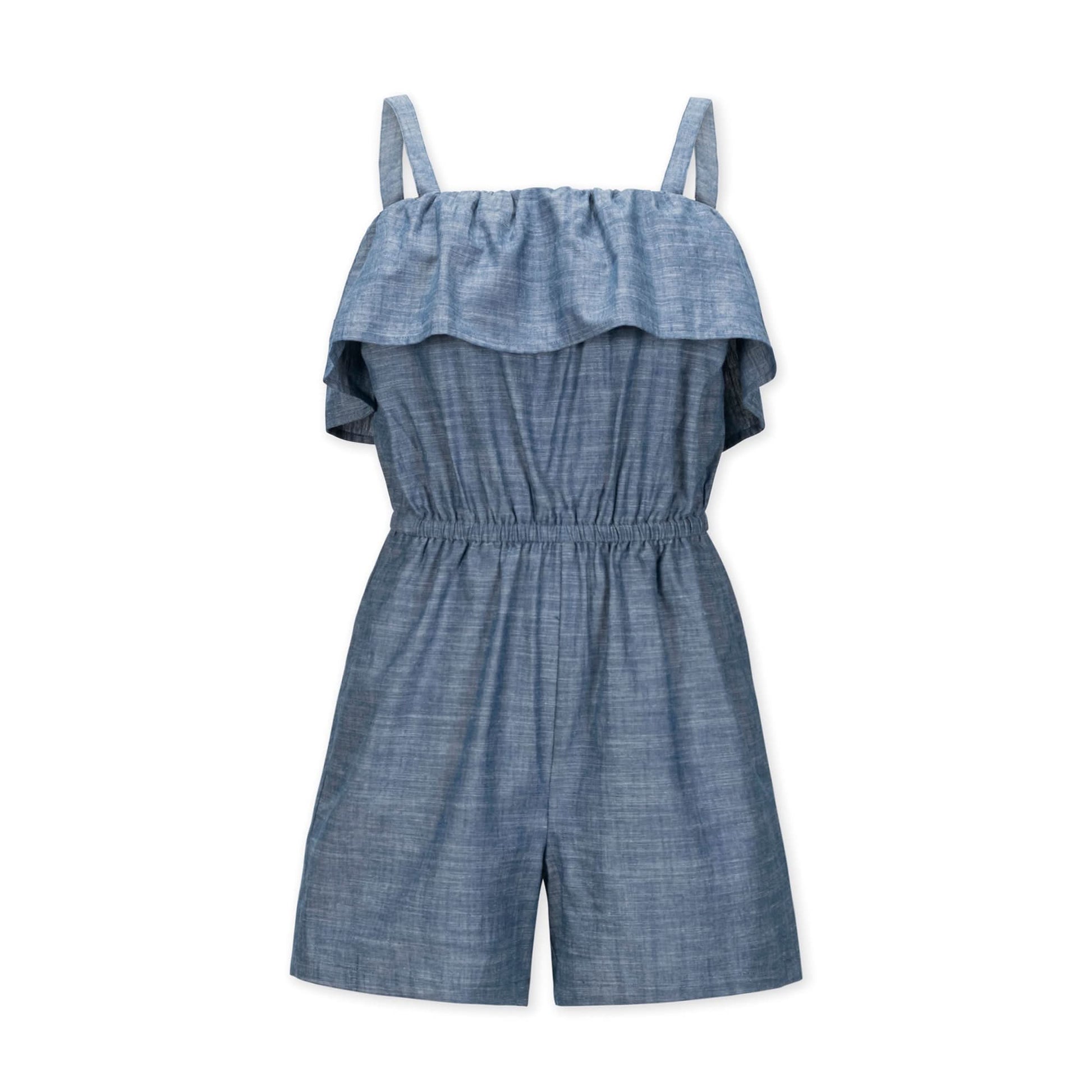 A feminine ruffle detail adds an on-trend touch to our warm-weather romper in a beautiful organic cotton chambray. Features side pockets (a must), flattering ruffled neckline, and stretchy elastic at the bodice and waistband for a comfortable, pull-on fit. Easy to dress up or down for all of your summer occasions!