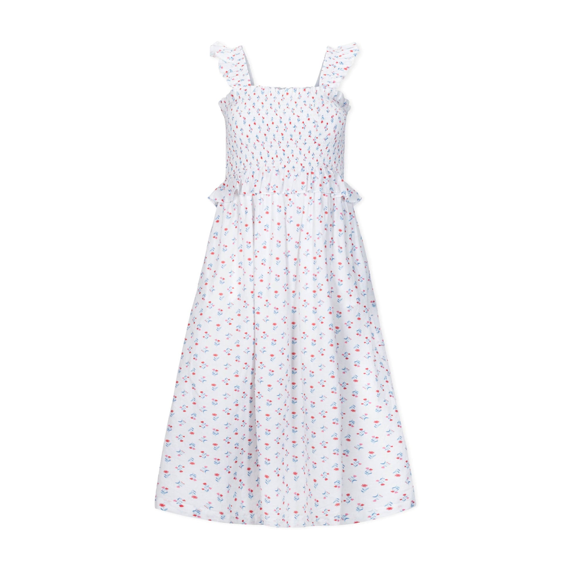Where pretty meets comfortable. Our beautiful sundress has feminine ruffled shoulder straps, a midi length skirt, and a stretchy and flattering smocked bodice. Cut in our soft organic cotton, this is the dress you'll want to wear all summer long. Fully lined in organic cotton. Can be dressed up or down with ease.