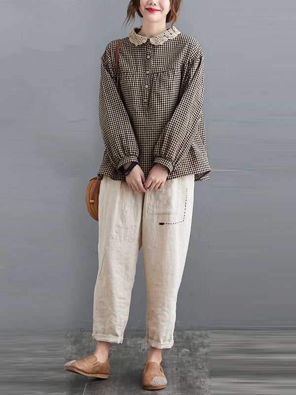 Plaid Ramie Cotton Plus Szie Long Sleeve Shirts
