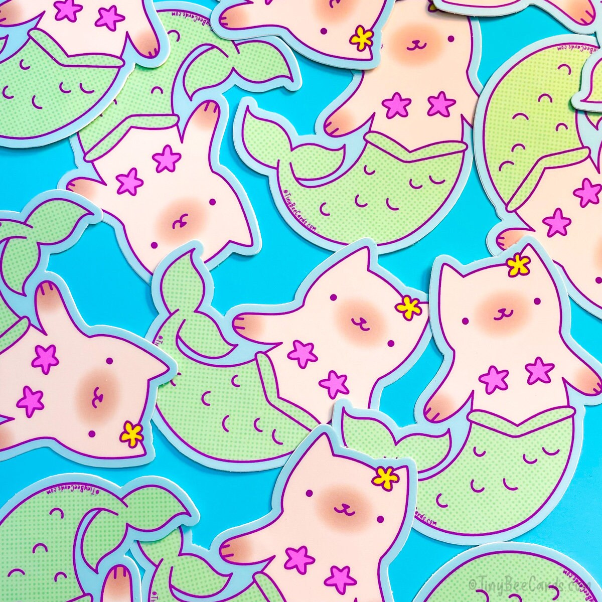 The enchanting mermaid cats or purrmaids are often seen chasing shimmering schools of fish, exploring hidden coral gardens, or batting at a seaweed leaf because was moving. Decked out in a starfish bra that's the envy of all sea creatures, she struts her stuff underwater with confidence. This adorable sticker combines the magic of mermaids with the irresistible charm of cats. Stick it on your laptop, water bottle, or any surface, and let it bring a splash of feline fantasy to your day.