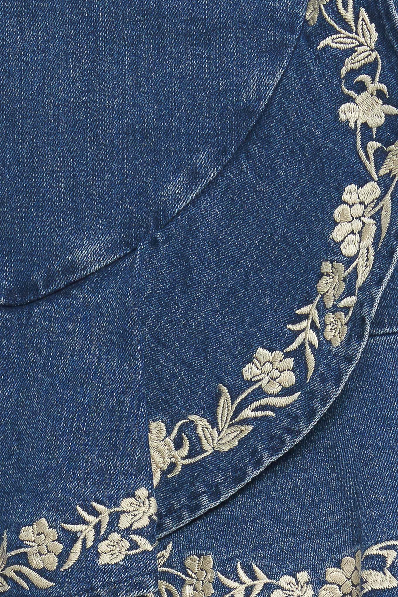 A washed denim skort featuring embroidered ruffle hem and side zipper closure