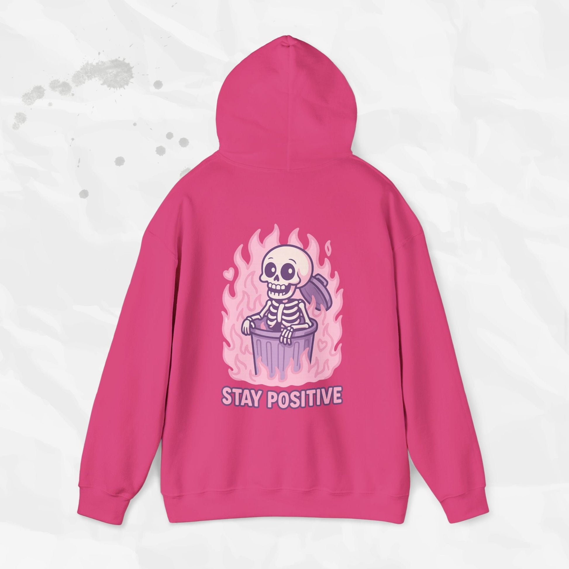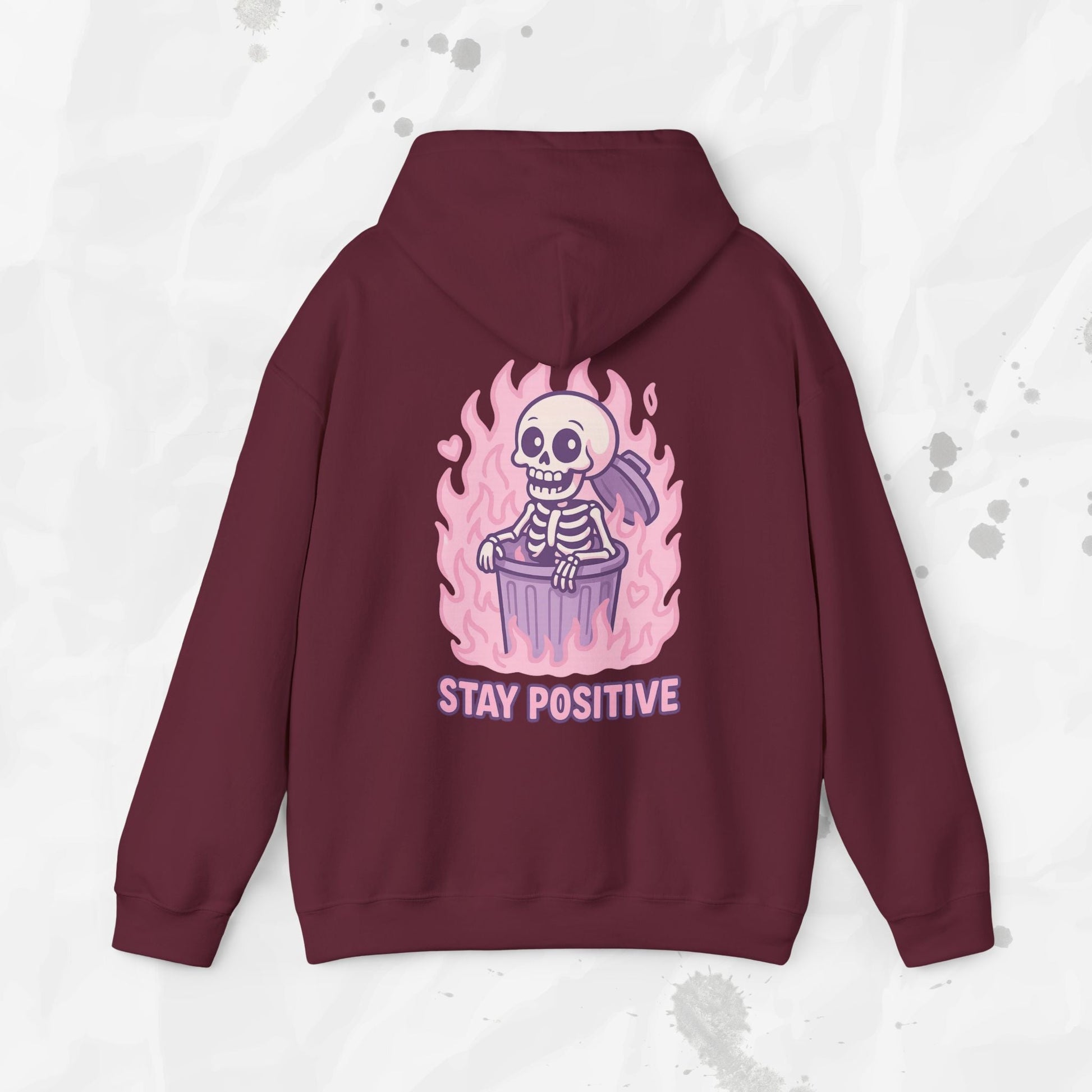 Burnout has never looked this optimistic. A skeleton in flames reminds you to “stay positive” — because sometimes delusion is the coping mechanism. Back print with small chest logo.