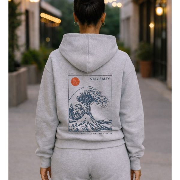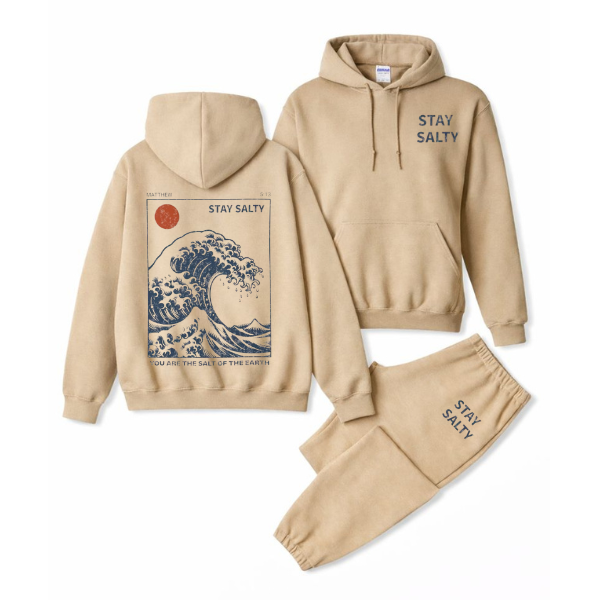 Introducing our "Stay Salty" Printed Sweat Set, a cozy and inspirational ensemble perfect for any casual outing or relaxed day at home. This set includes a comfortable hoodie and matching sweatpants, both crafted from high-quality Gildan fabric for ultimate softness and durability. The design features the uplifting message, “You are the salt of the earth,” from Matthew 5:13, elegantly printed, reminding you and those around you of the importance of preserving goodness and adding flavor to the world. Whether you're lounging, exercising, or simply running errands, this sweat set will keep you stylish and motivated. Embrace comfort and faith with our "Stay Salty" set today!