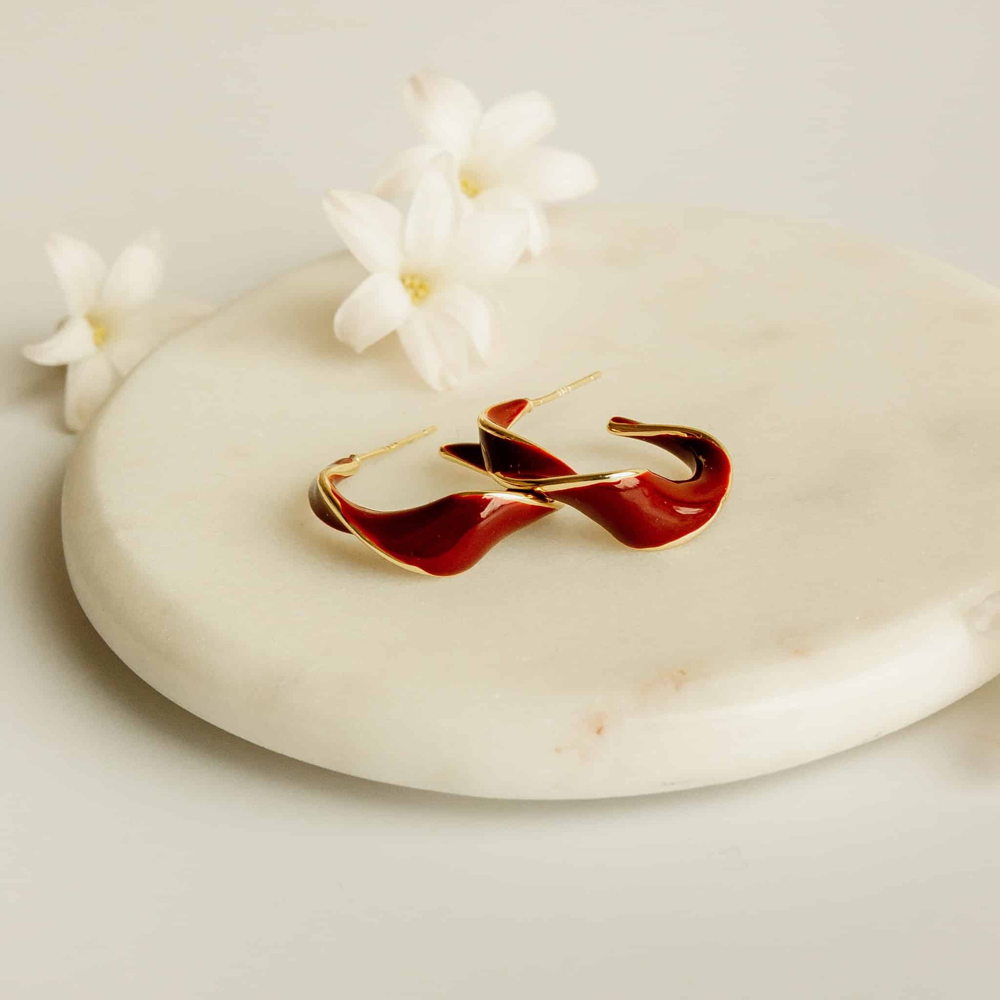 These lightweight hoops are twisted deep red burgundy and gold. They're perfect for adding a chic, festive, and elegant touch to any outfit. Plus, by purchasing them, you're supporting women who have escaped human trafficking. How awesome is that?!
