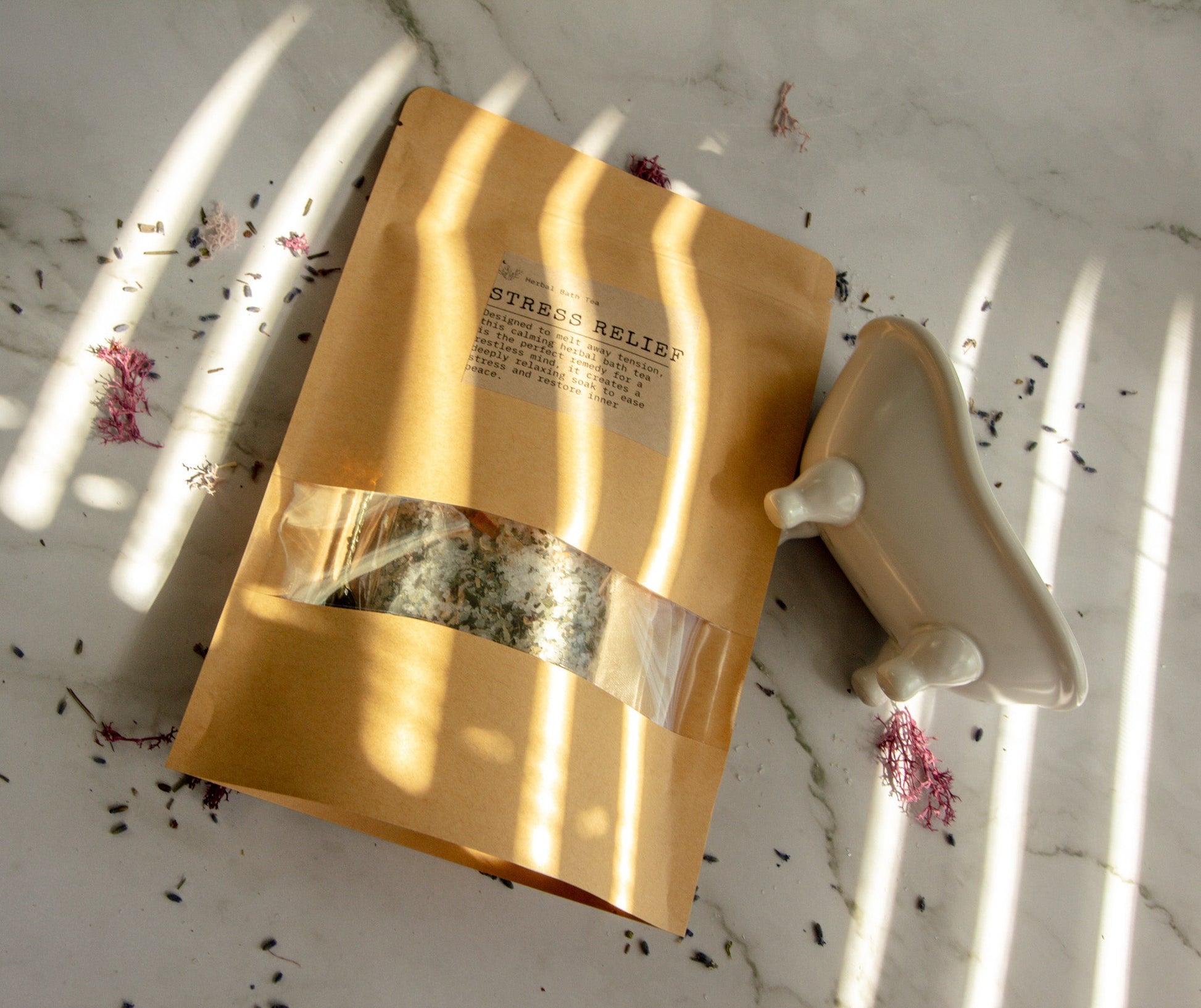 Our herbal bath tea is available in three packaging options to suit your self-care routine: