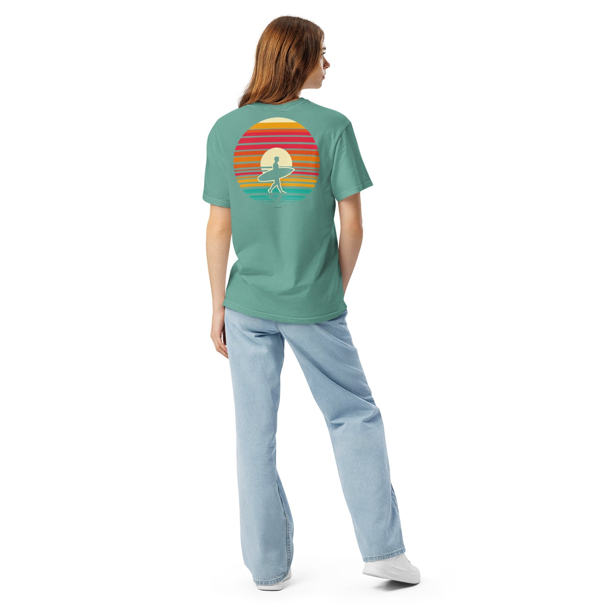 The Sunset Surfer Tee brings big surf energy in a clean, minimalist form. A bold stripe sunset surrounds a surfer walking along the shoreline—perfectly capturing the calm before the wave. On the front left chest, a beachside palm sunset adds an extra dose of laid-back tropical flair.