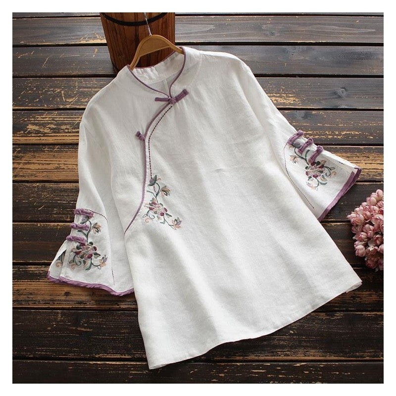 Sure! How about "Chic Embroidered Mandarin Collar Cotton and Linen Tea Dress"?