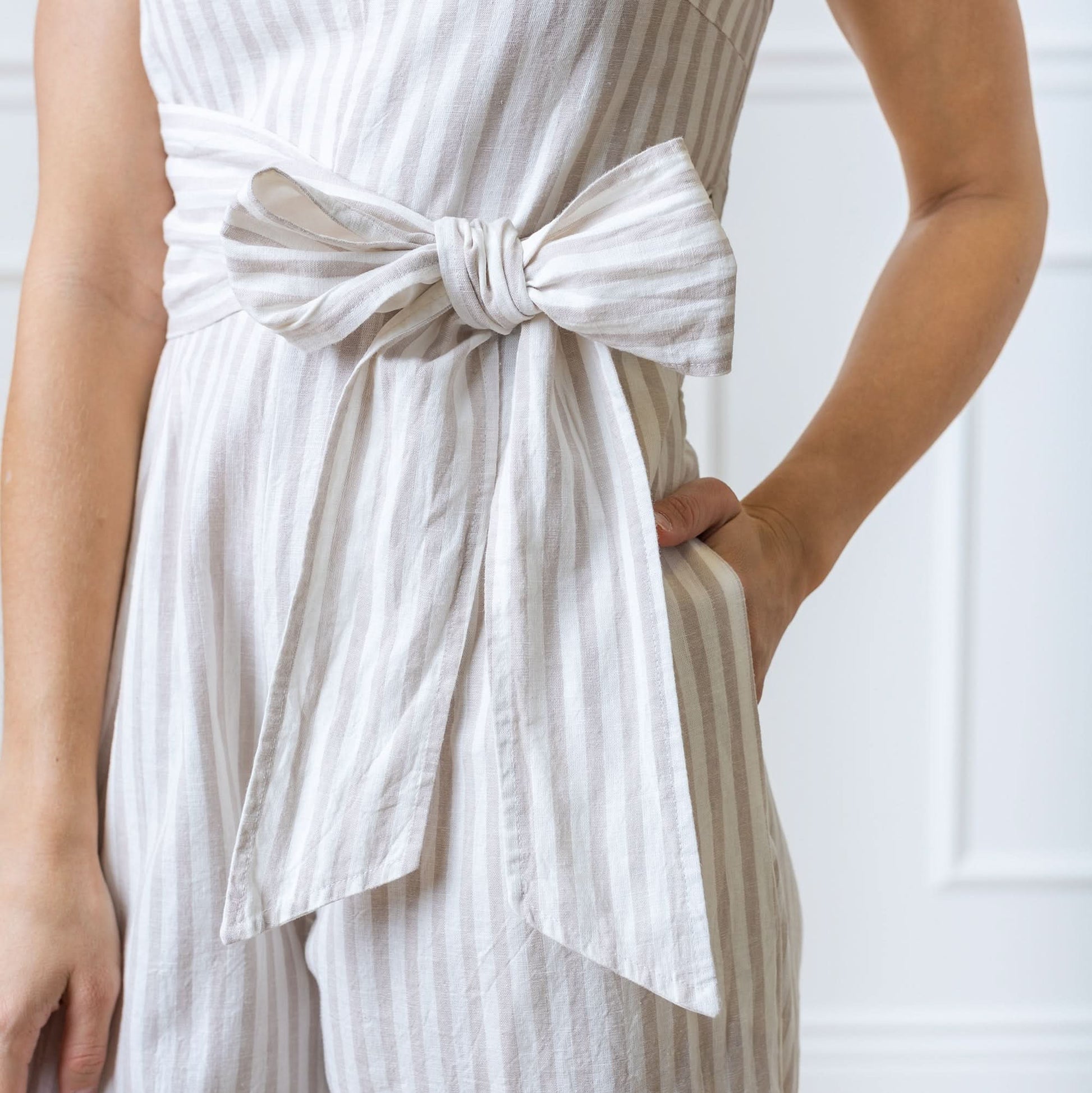With a playful waist tie and flattering wide leg, our easy wrap back jumpsuit can be dressed up or down depending on how you style it. Features a v-neck and a hidden side zipper for easy dressing.